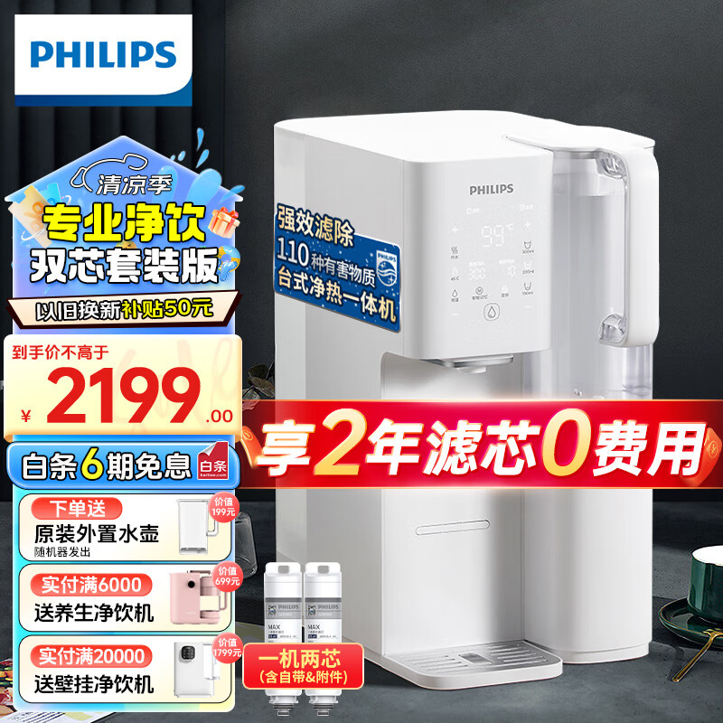 飞利浦(PHILIPS)Cube家用RO反渗透台式即热净饮水机加热直饮一体机富锶矿化免安装净水器ADD6860一机两芯价格:2199.00元!