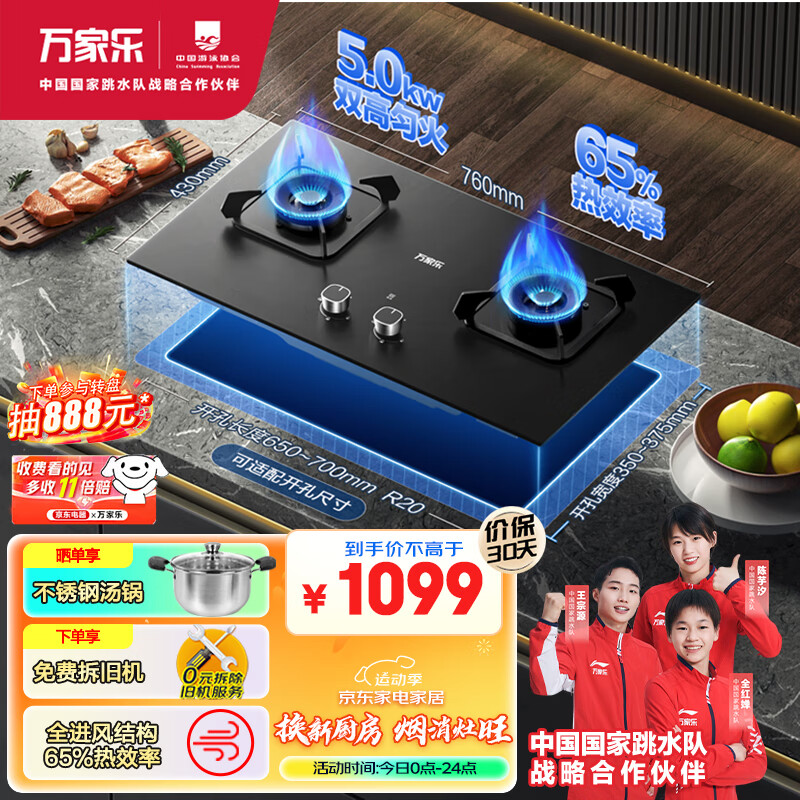 万家乐燃气灶5.0kW火力 家用嵌入式燃气灶具 钢化玻璃面板双灶 烟灶联动 全进风JZT-KV063B天然气价格:1199.00元!
