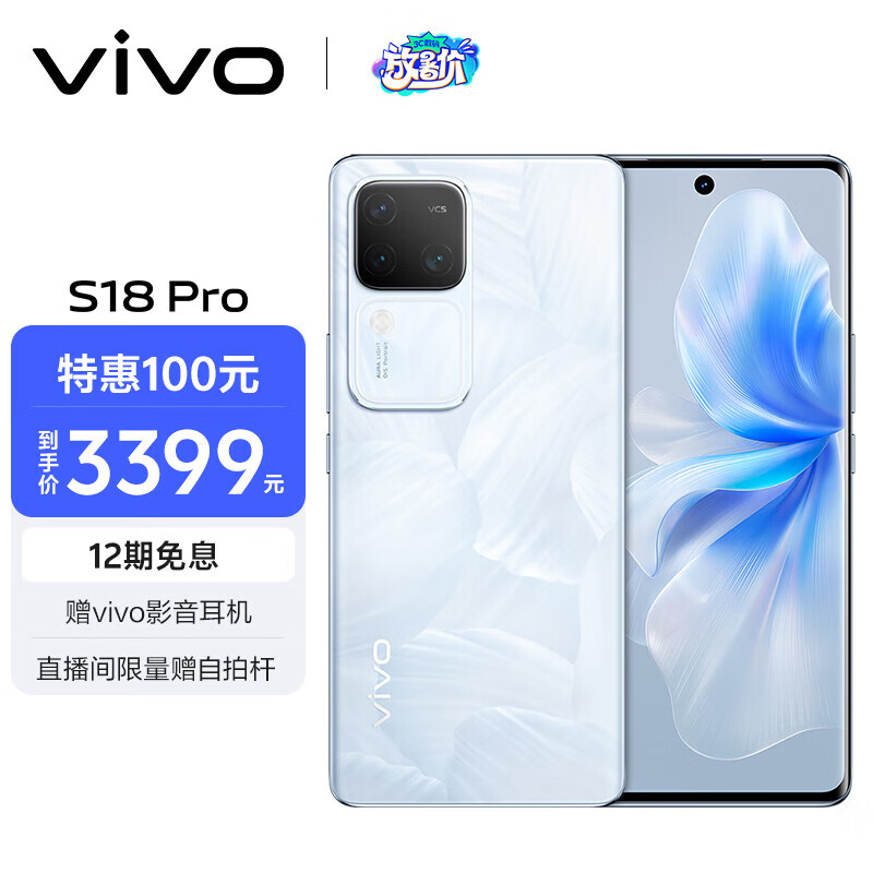 vivo S18 Pro 16GB+256GB 花似锦 天玑9200+旗舰芯片 后置影棚级柔光环 5000mAh超薄蓝海电池 拍照手机价格:3499.00元!