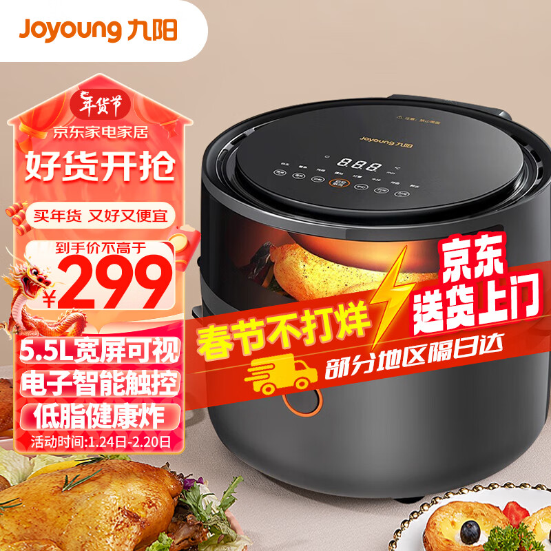 九阳(Joyoung)空气炸锅家用多功能智能 5.5L大容量可视窗口 智能触控 无油煎炸 烤箱 KL55-VF531价格:299.00元!