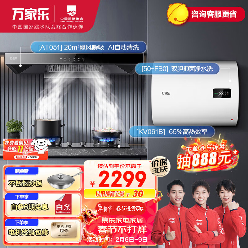 万家乐烟灶热三件套装 20立方挥手烟灶50L扁桶WIFI智控电热水器多件套装AT051+KV061B+50FB0天然气价格:2499.00元!