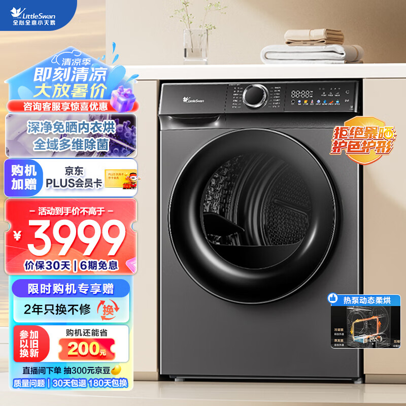 小天鹅(LittleSwan)热泵烘干机家用 全自动干衣机 10公斤大容量 多维除菌除螨 毛屑过滤 TH100VH617MAX价格:3999.00元!