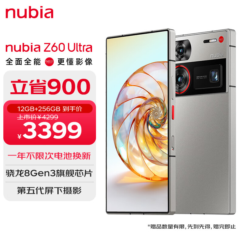 nubia 努比亚Z60 Ultra 屏下摄像12GB+256GB 银河 第三代骁龙8 三主摄OIS 5G手机游戏拍照努比亚手机价格:3599.00元!