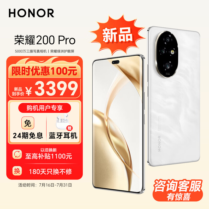荣耀200 Pro 新品 旗舰级青海湖电池 绿洲护眼屏 5000万雅顾光影主摄 12+256 月影白 5G AI手机价格:3399.00元!