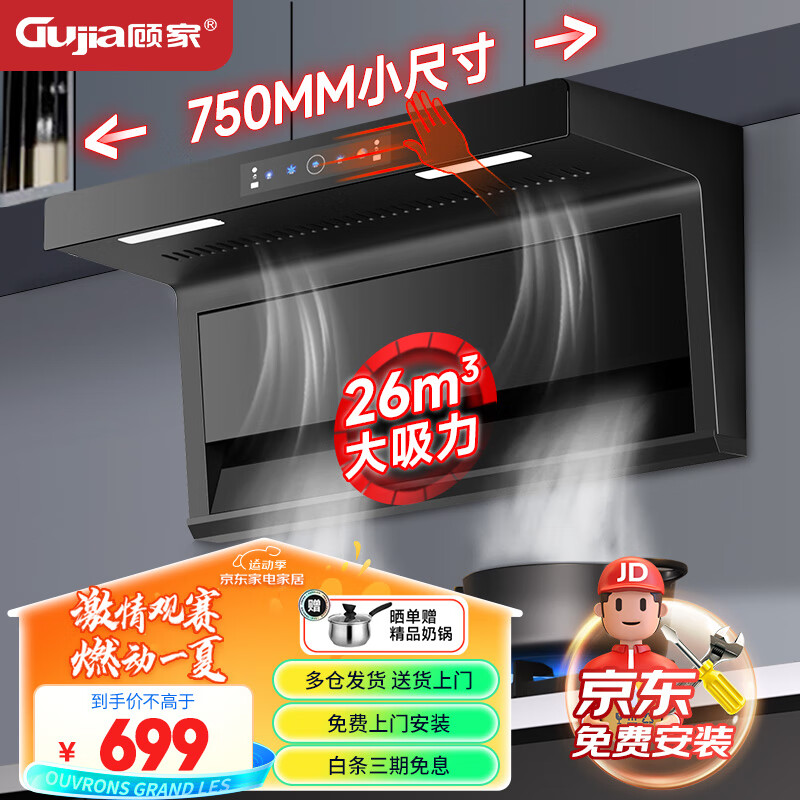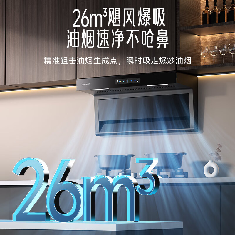 顾家(Gujia)抽油烟机7字型家用顶侧双吸油烟机26立方大吸力小尺寸体感自动清洗一级能效免清洗价格:999.00元!