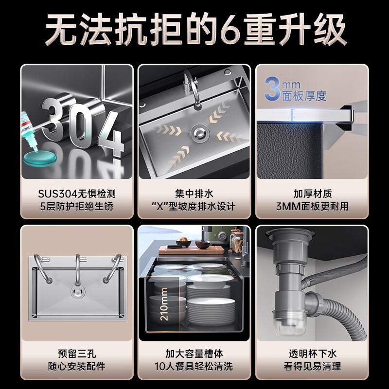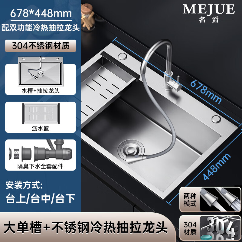 名爵(MEJUE)厨房水槽304不锈钢水池洗碗池手工大单槽洗菜盆一体盆台下盆2468价格:479.00元!