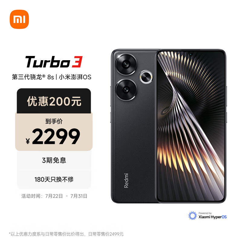 小米Redmi Turbo 3 第三代骁龙8s 小米澎湃OS 16+512 墨晶 AI功能 红米5G手机价格:2299.00元!