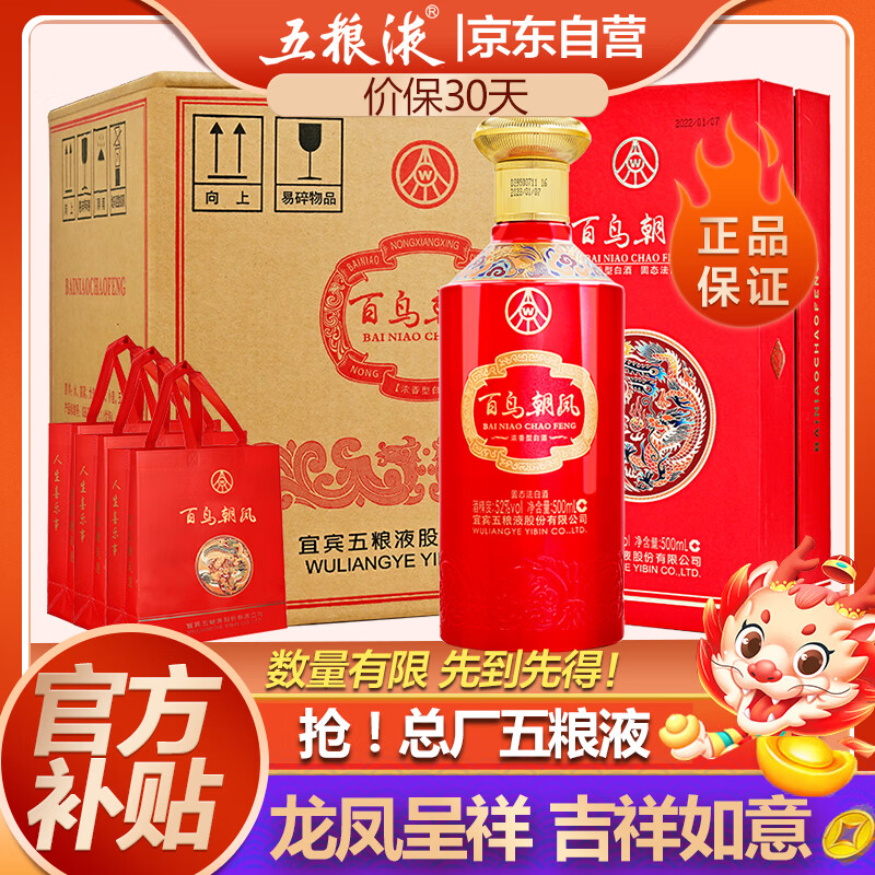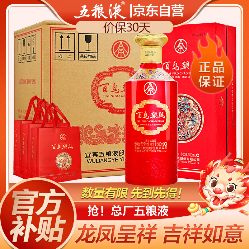 五粮液百鸟朝凤五彩红浓香型白酒礼盒整箱6瓶52度500ml喜酒水龙年货送礼价格:620.00元!