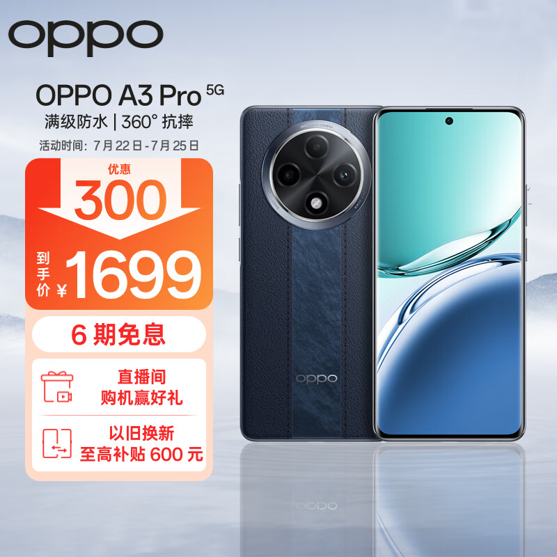 OPPO A3 Pro 5G 耐用战神 满级防水 360°抗摔 四年耐用大电池 8GB+256GB 远山蓝 超抗摔护眼屏 AI手机价格:1999.00元!