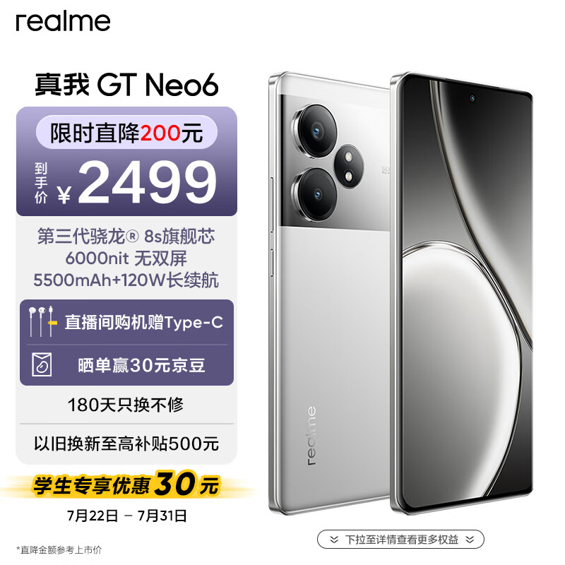 realme真我GT Neo6 第三代骁龙8s旗舰芯 6000nit无双屏 120W光速秒充 电竞5G游戏AI手机 16+512流银骑士价格:2499.00元!