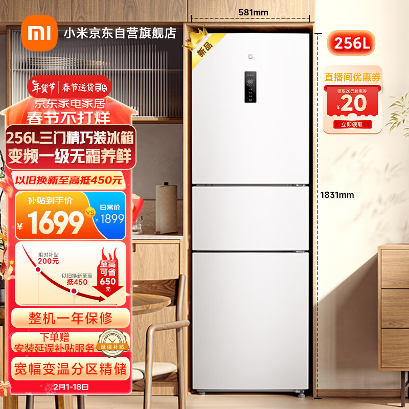 米家小米256升变频一级风冷无霜三门小型家用电冰箱 超薄小占地白色银离子除菌净味 BCD-256WMSA价格:1699.00元!
