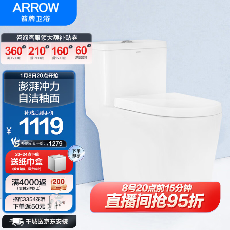 箭牌(ARROW)家用大冲力强承重喷射虹吸隔臭节水马桶缓降连体坐便器AEB12607M价格:1559.00元!