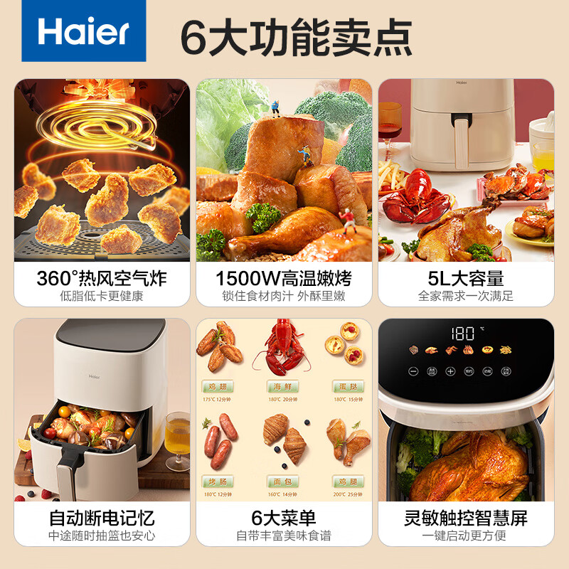 海尔空气炸锅 5L家用 大容量触控 免翻面预约 不粘易清洁 低脂电炸锅炸烤箱一体机薯条机 HA-E5020W价格:219.00元!