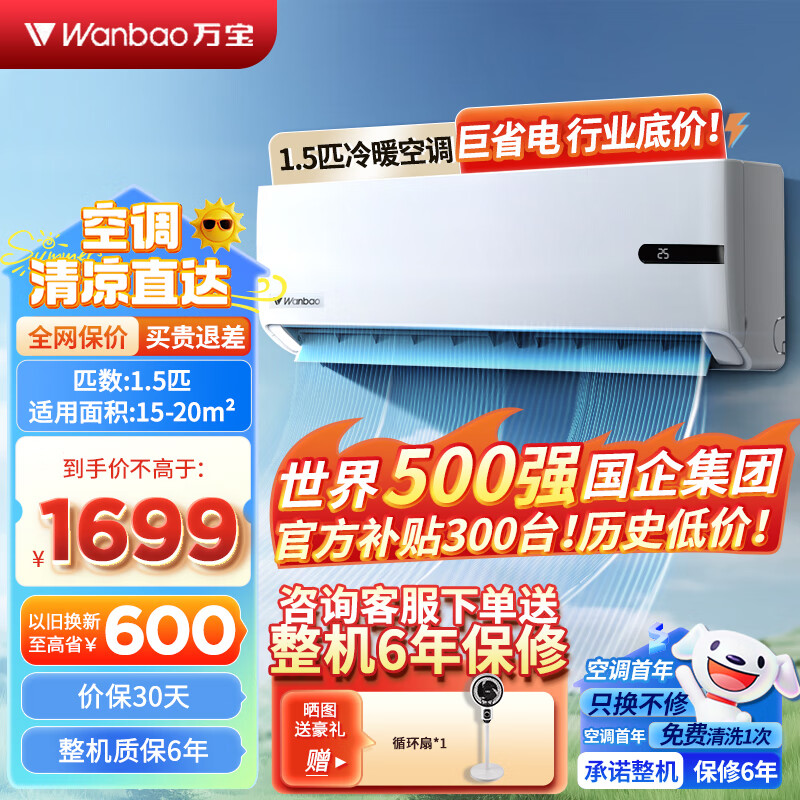 万宝空调挂机1.5匹出租房 一级变频省电家用壁挂式空调 1.5匹 一级能效KFR-35GW/BPWB2-N1价格:1699.00元!