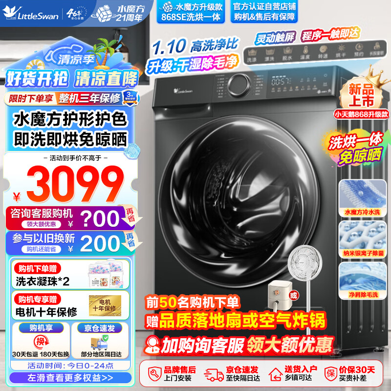 小天鹅(LittleSwan)小天鹅滚筒洗衣机洗烘一体全自动10公斤 水魔方护色护形除菌除螨一级能效以旧换新【TD100V868SE】价格:3099.00元!