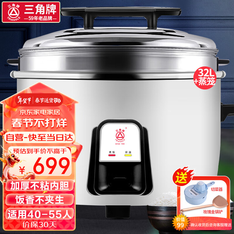 三角牌(Triangle)电饭煲大容量老式电饭锅食堂商用大电饭煲酒店饭店大型蒸饭锅 32升带蒸笼 40-55人适用价格:699.00元!