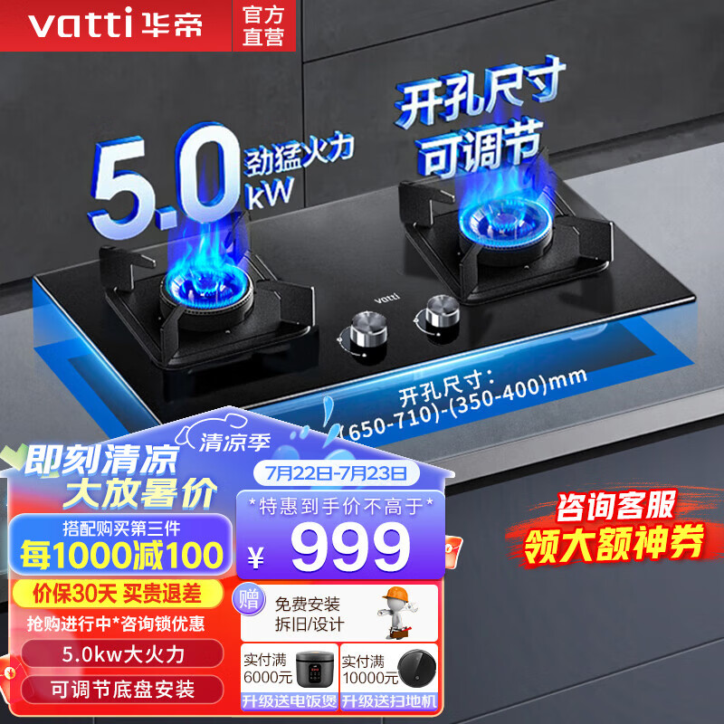 华帝(VATTI)i10070B燃气灶官方5.0kw多档火力灶具台嵌两用一级能效可调节安装开孔尺寸易清洁 单品 天然气价格:1299.00元!