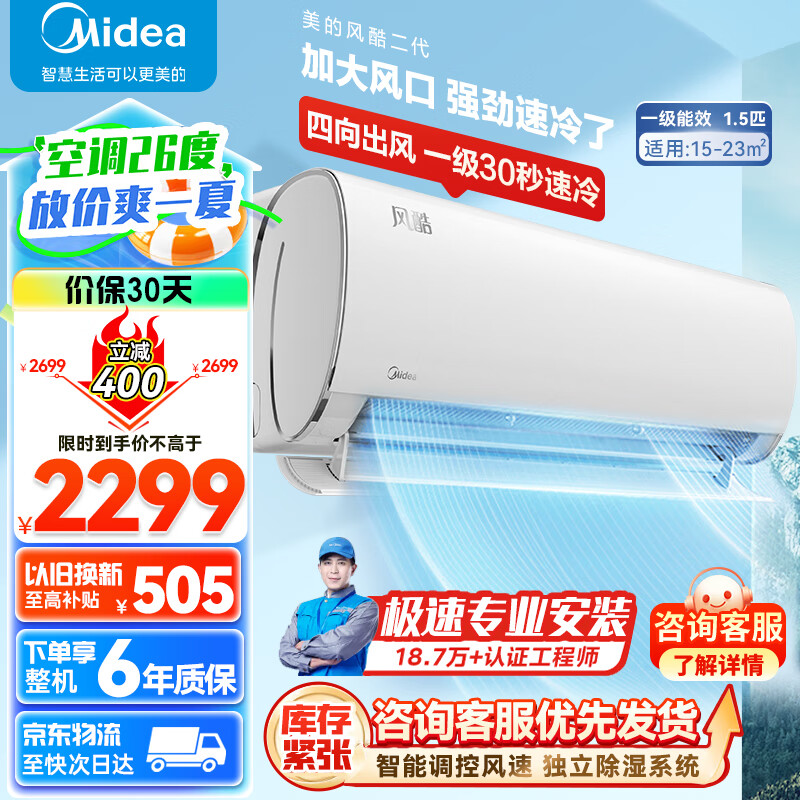 美的(Midea)空调挂机1.5匹 风酷Ⅱ二代全新升级 一级能效变频节能省电 冷暖两用壁挂式挂机KFR-35GW/N8XHC1Ⅱ价格:2299.00元!