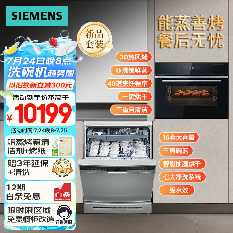 西门子(SIEMENS)洗嵌套装 16套智能抽湿烘干大容量洗碗机 嵌入式蒸烤炸炖四合一套装 CS8J4DNB1W+SJ23HI88MC价格:10199.00元!