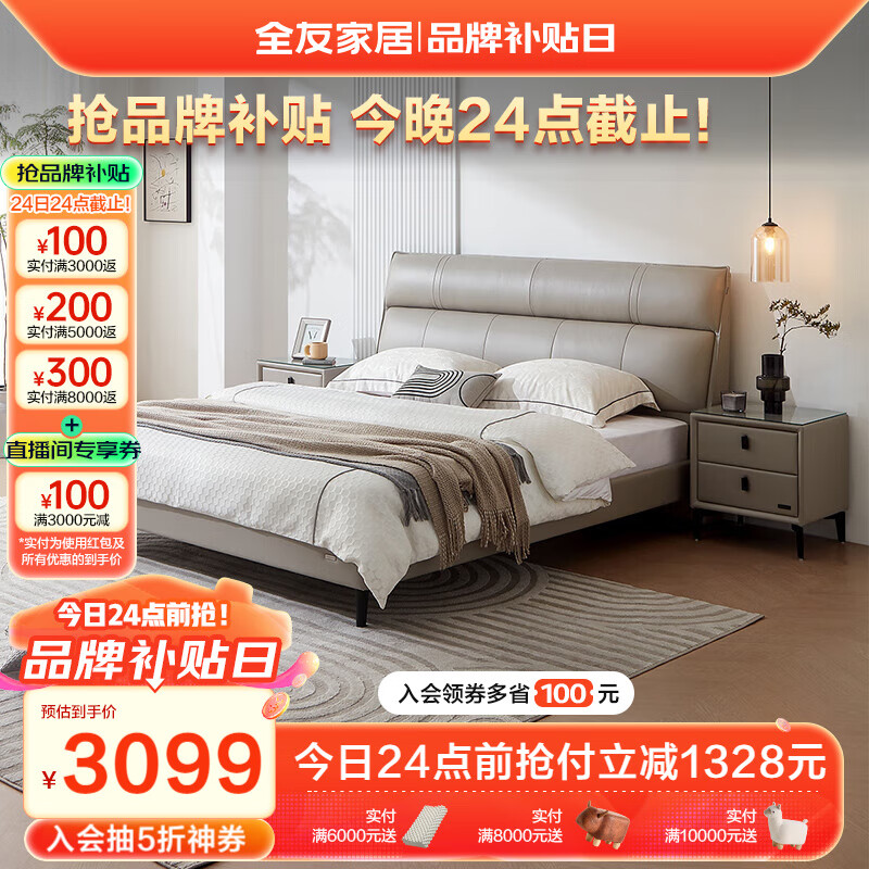 全友家居 头层牛皮床真皮床现代简约卧室高脚双人大床1.8米x2米116033价格:4427.14元!