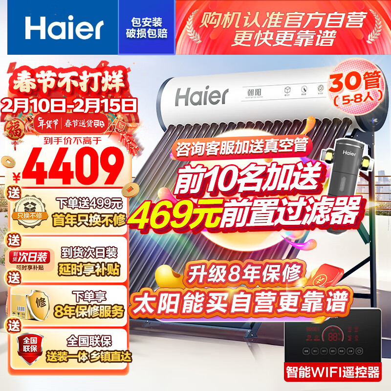 海尔(Haier)太阳能热水器家用一级能效保温聚热环WIFI自动上水光电两用预约加热 30管220升-S6价格:4709.00元!