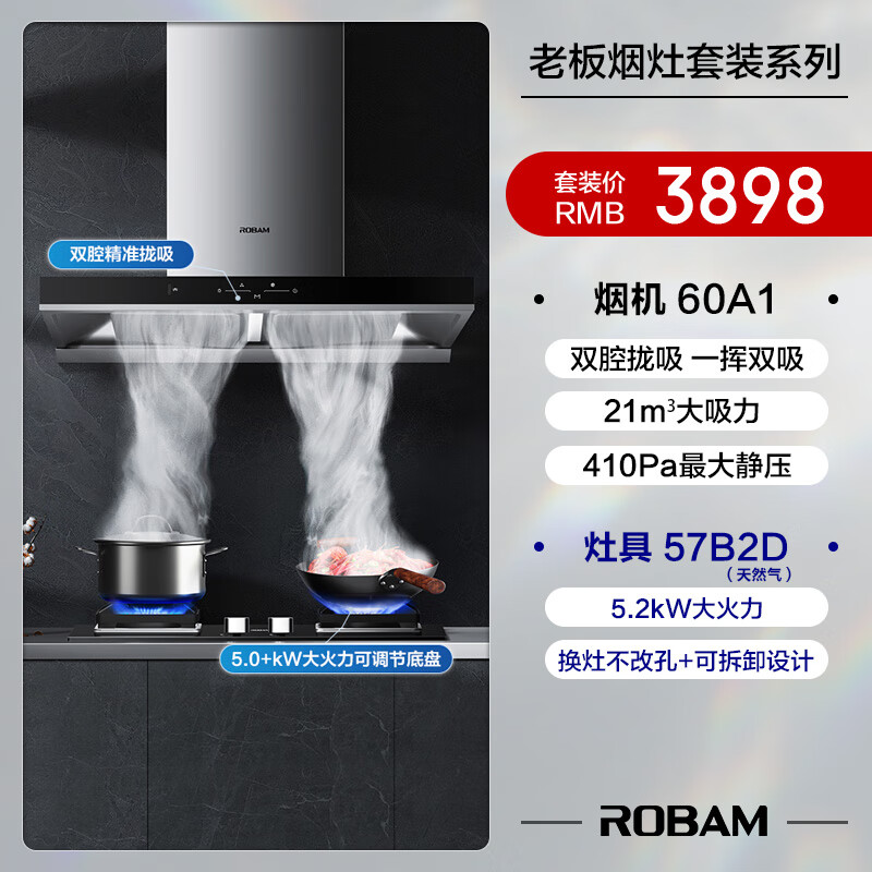 老板(Robam)抽油烟机 欧式双腔顶吸21风量免拆洗吸油烟机燃气灶油烟机灶具套装60A1+57B2D(天然气)价格:3898.00元!