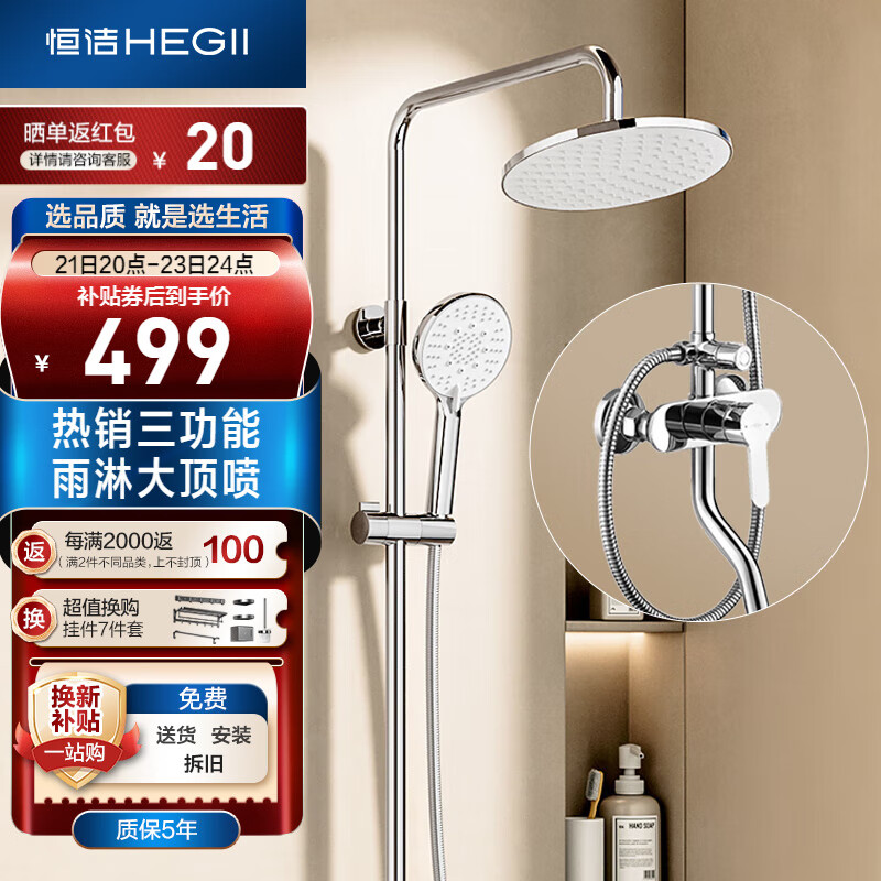 恒洁(HEGII)淋浴花洒套装 铜合金可升降调节除垢花洒全套HMF916-333价格:649.00元!