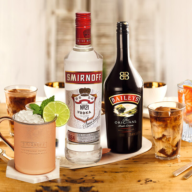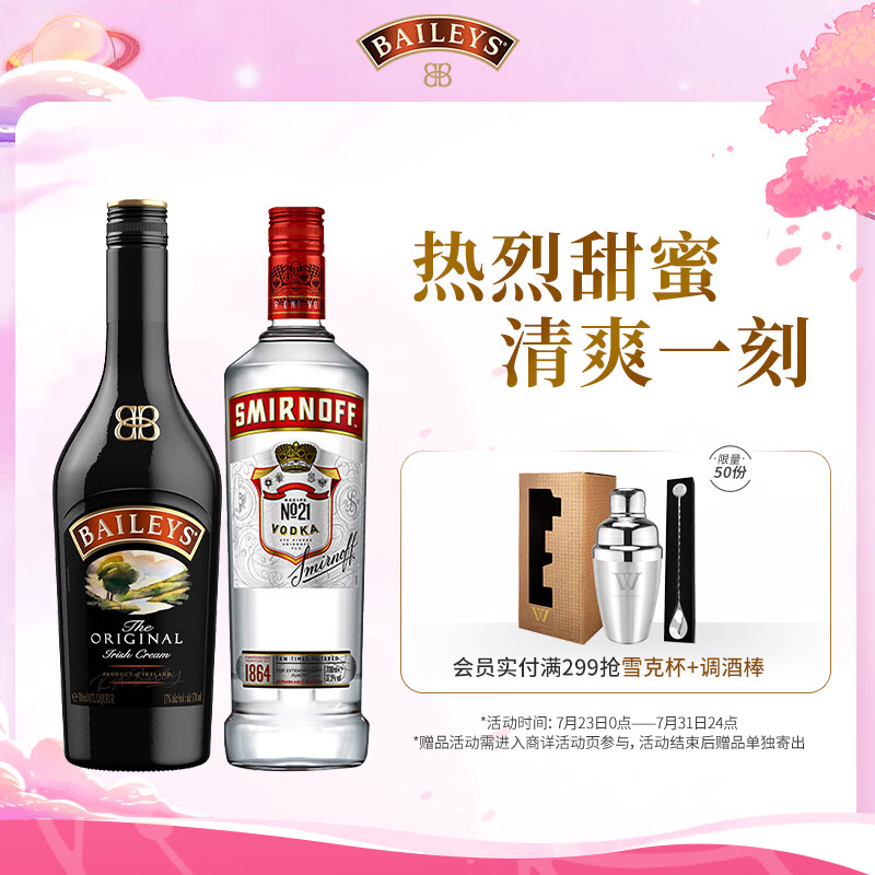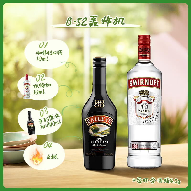 百利(Baileys)甜酒 力娇酒利口酒 奶酒 原味500ml+斯米诺红牌基酒伏特加700ml价格:115.00元!