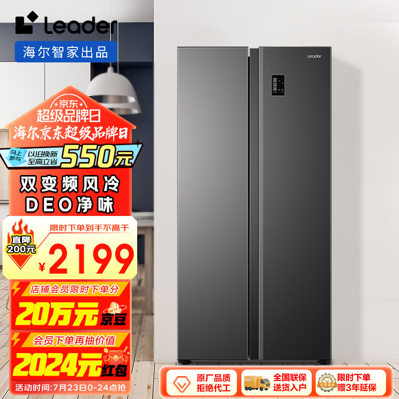 Leader 海尔智家出品477升大容量风冷无霜对开门双开门家用变频以旧换新超薄电冰箱BCD-477WLLSSD0S9U1价格:2599.00元!