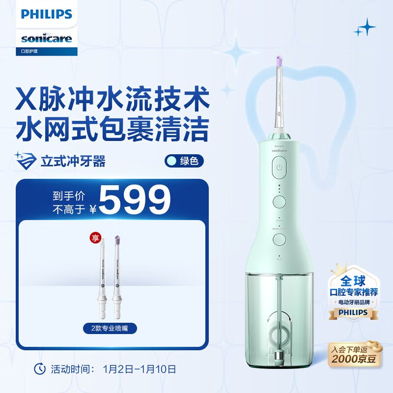 飞利浦家用立式冲牙器男/女立式手持2种洁齿模式3级洁齿力度美牙舱HX3806/34 绿色送礼 新年礼物价格:679.00元!