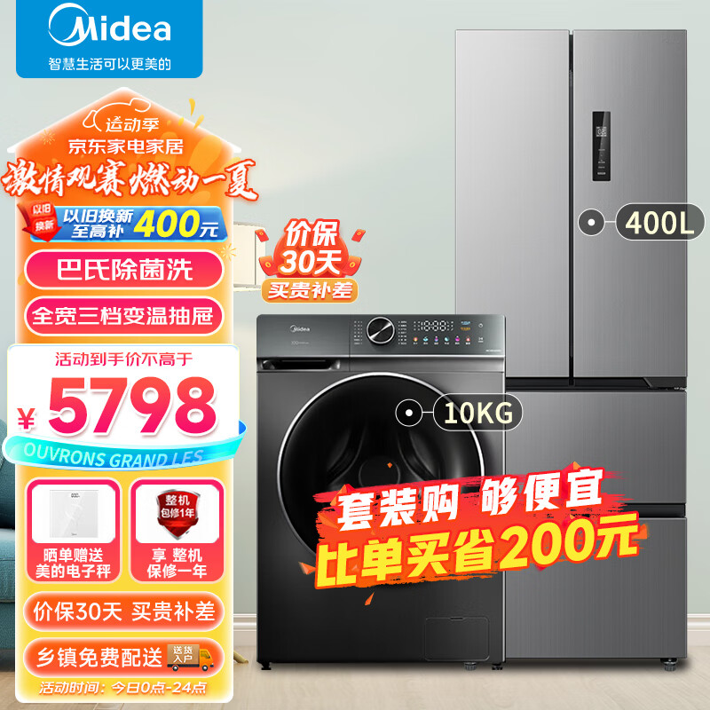 美的(Midea)417法式多门四开门冰箱 M60超薄冰箱+10公斤洗烘一体洗衣机MR-417WFPE+MD100V650DE价格:5798.00元!