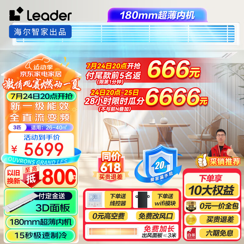 Leader海尔智家出品3匹P元气风管机一拖一级能效中央空调嵌入式全直流变频客厅空调 KFRd-72NW/73ED81TU1价格:5699.00元!