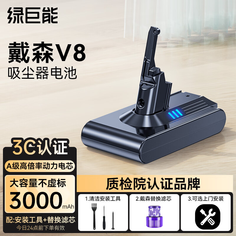 绿巨能(llano)适用戴森Dyson电池V8吸尘器充电锂电池V8 Fluffy/Absolute/Animal Pro/PM8.SV10型号 3000mAh价格:249.00元!