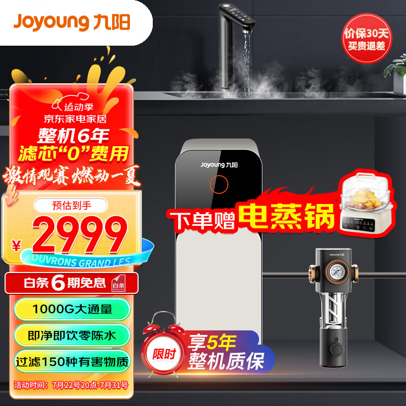 九阳(Joyoung)热小净1000G加热净水器2.5L/min即热净水机家用RO反渗透直饮机R1-1000G+前置过滤器 净热套装价格:2999.00元!