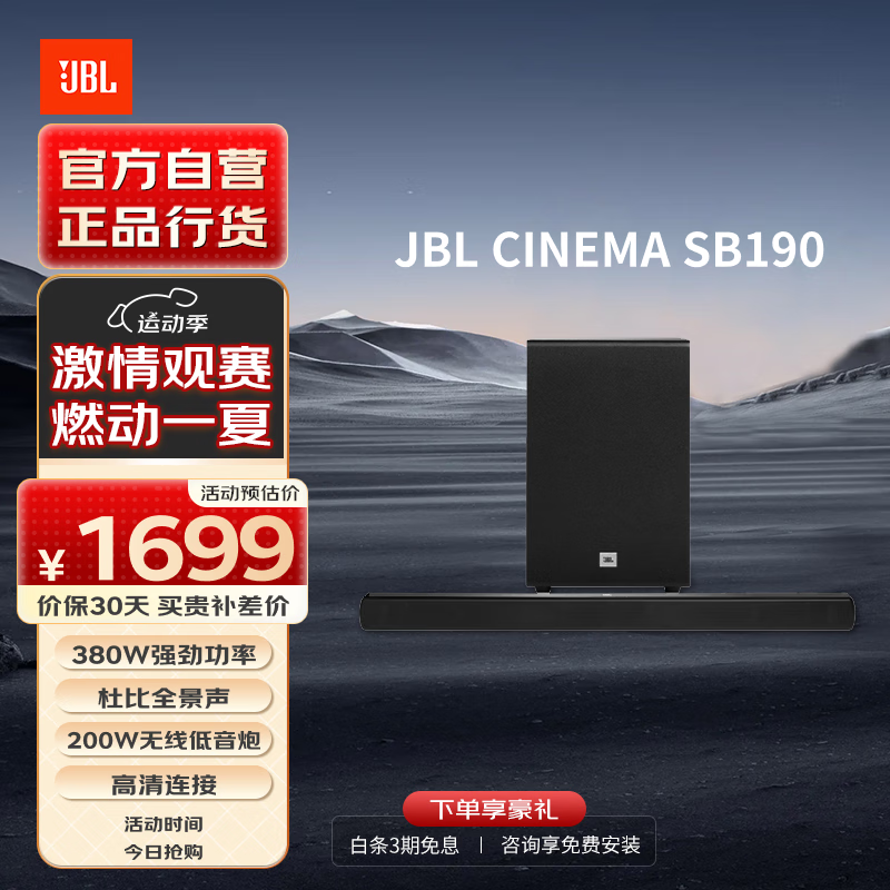JBL CINEMA SB190回音壁电视音响 2.1杜比全景声家庭影院soundbar 大功率低音炮 投影仪无线蓝牙音箱价格:1699.00元!