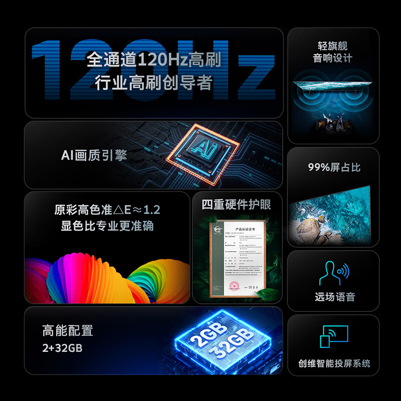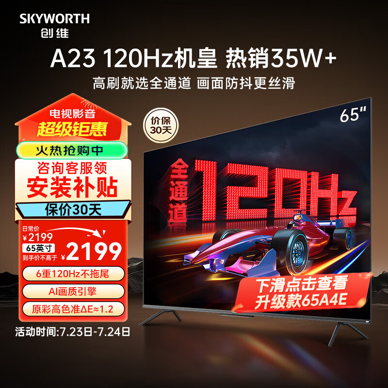 创维电视65A23 65英寸全通道120Hz高刷HDMI2.1 2+32G声控平板电视机以旧换新 65英寸价格:2199.00元!