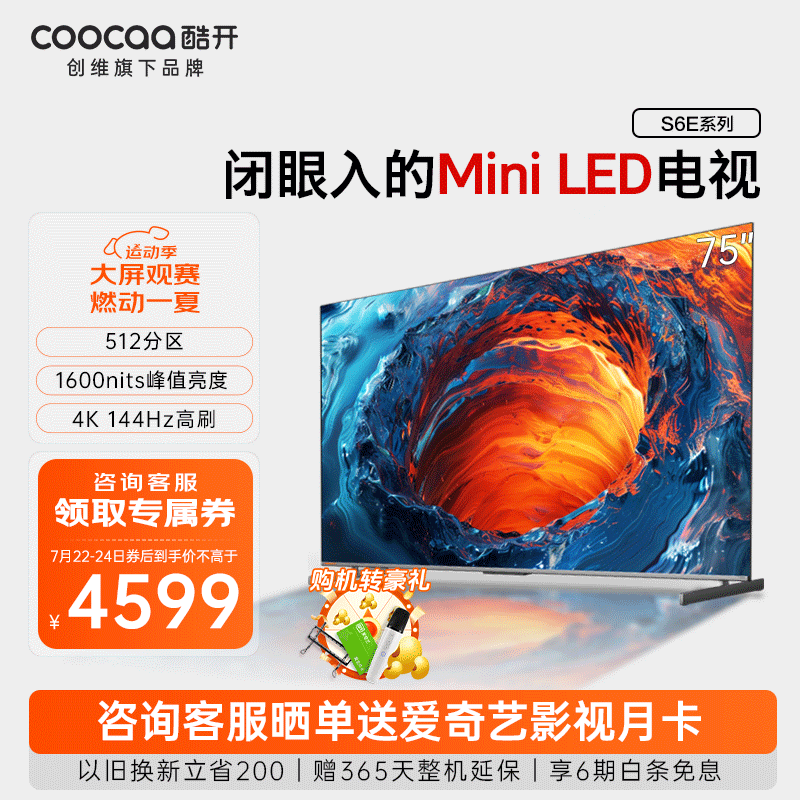 酷开 创维电视S6E 75英寸 Mini LED电视 512分区 1600nits 4K 144Hz高刷 护眼智能平板电视以旧换新 K6 75英寸价格:4599.00元!