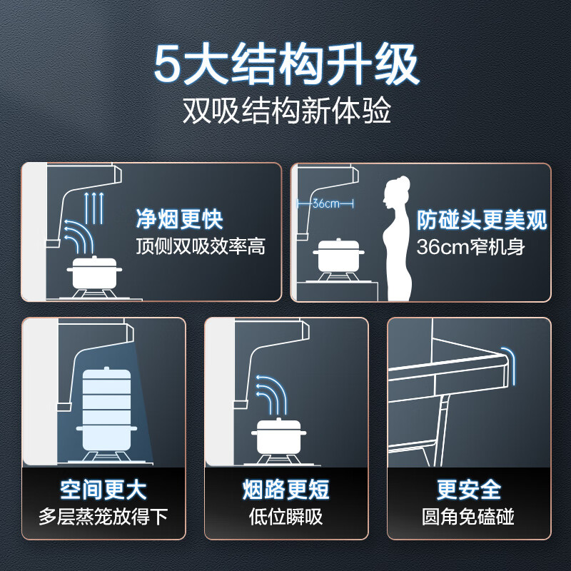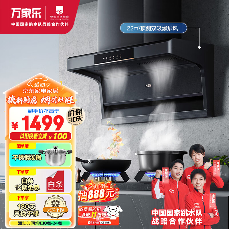 万家乐 抽油烟机 顶侧双吸油烟机 23m3/min爆炒大吸力 7字型家用自清洗 挥手感应单烟机CXW-320- AK5价格:1699.00元!