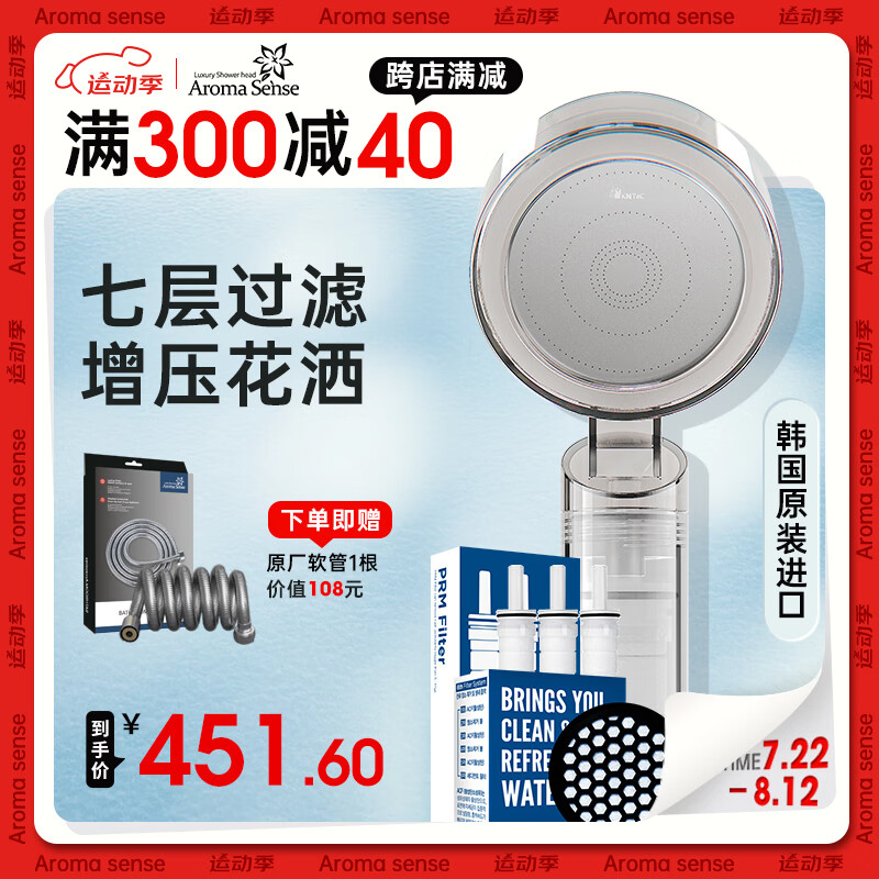 Aroma Sense淋浴花洒喷头增压韩国进口活性碳过滤除氯净水加压手持莲蓬头 PR9000白色套装+软管价格:528.00元!