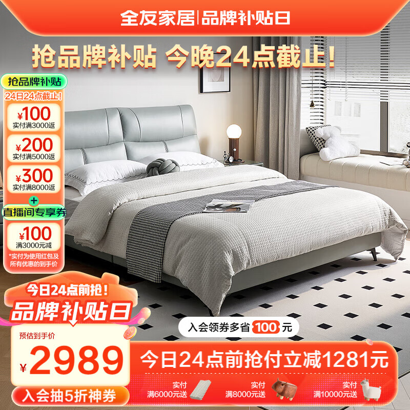 全友家居 真皮艺床现代轻奢主卧室头层牛皮双人大床1.8x2米家具105201价格:4270.00元!