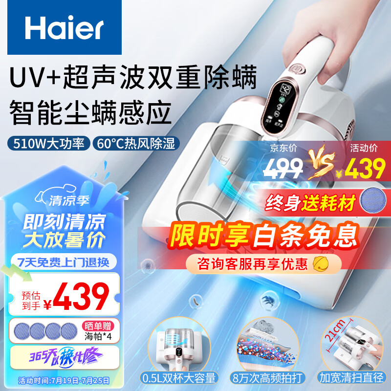 海尔(Haier)除螨仪家用手持床上大吸力双杯智能除螨仪 超声波紫外线杀菌去螨虫 热风除湿 HZ-C9W价格:439.00元!