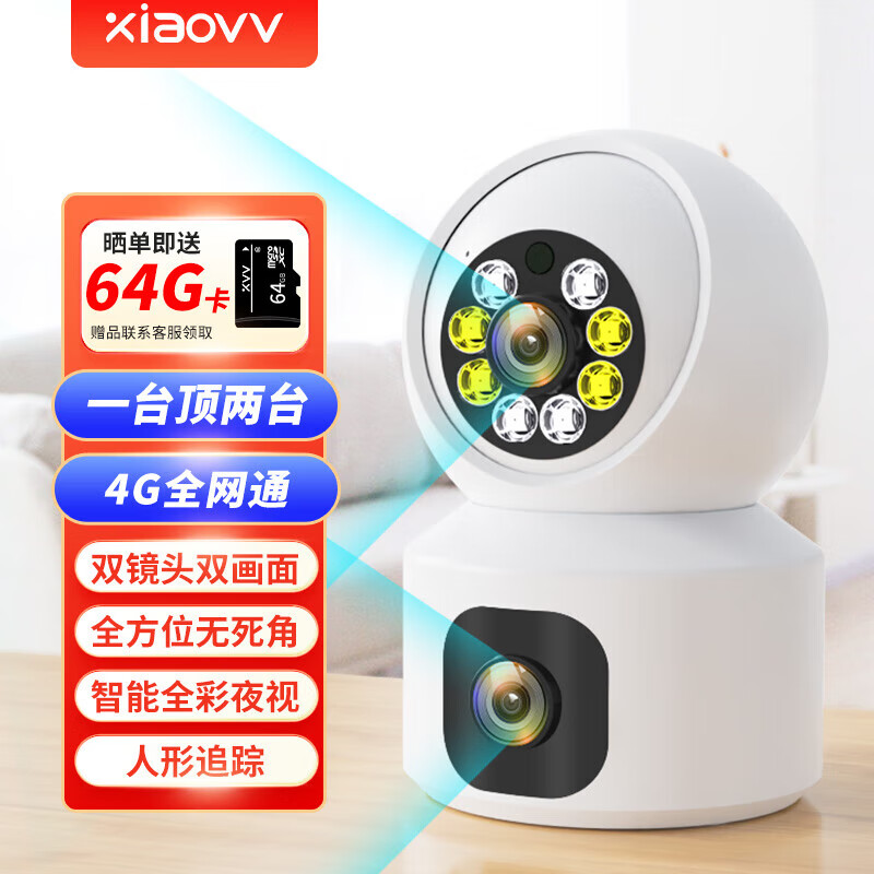 xiaovv双摄像头监控器4g家用360度自动旋转可对话高清家用带夜视家庭无线室内全景无需连wifi网络插卡价格:149.00元!