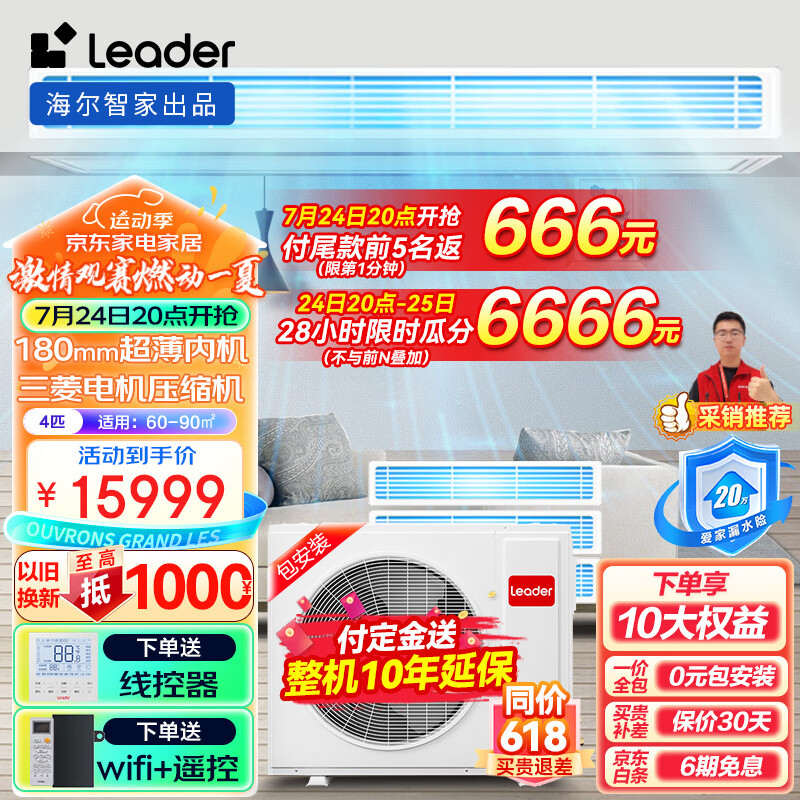 Leader海尔智家出品中央空调4匹一拖三 嵌入式全屋空调智能多联机全直流变频一级能效元气RFC100TSA1VA价格:15999.00元!
