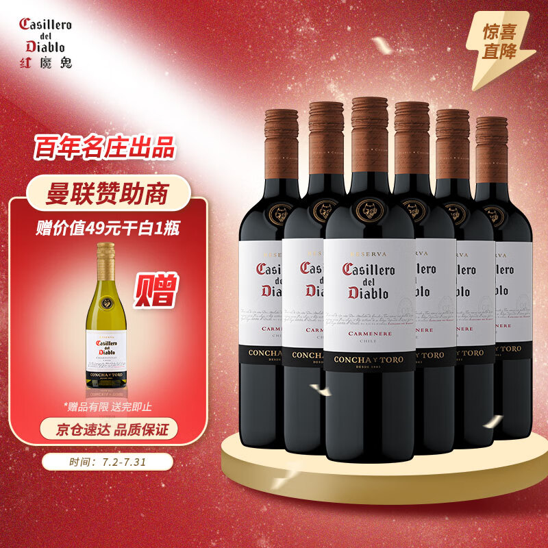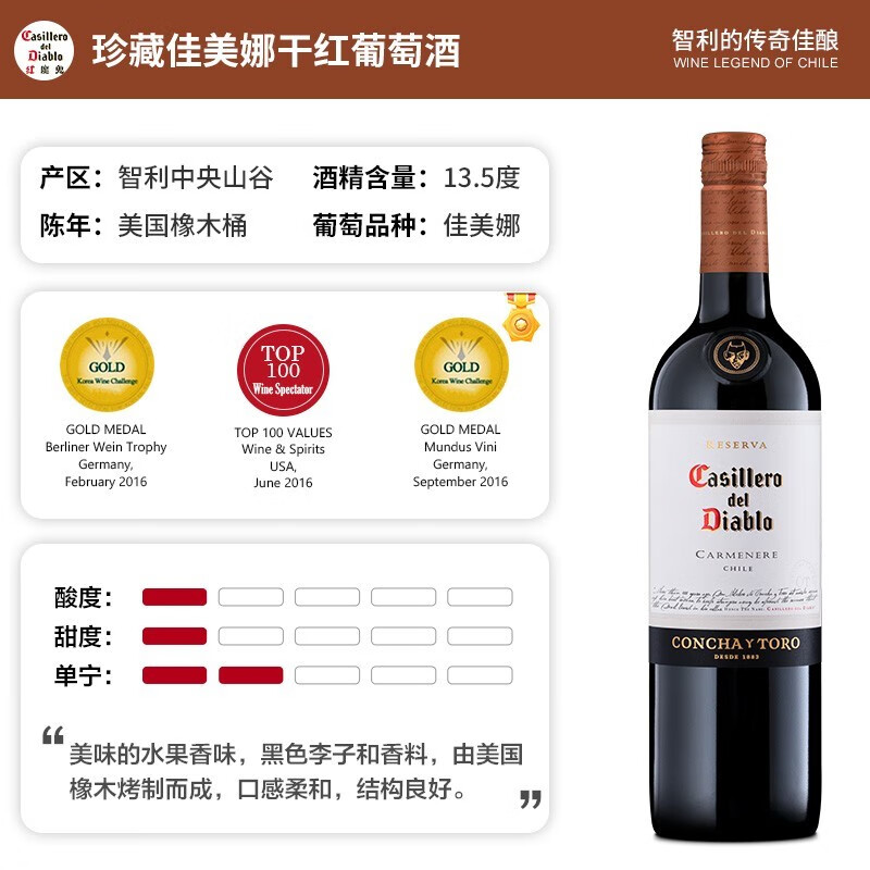 红魔鬼(Casillero del Diablo)佳美娜干红葡萄酒 750ml*6瓶整箱装 智利进口红酒价格:359.00元!