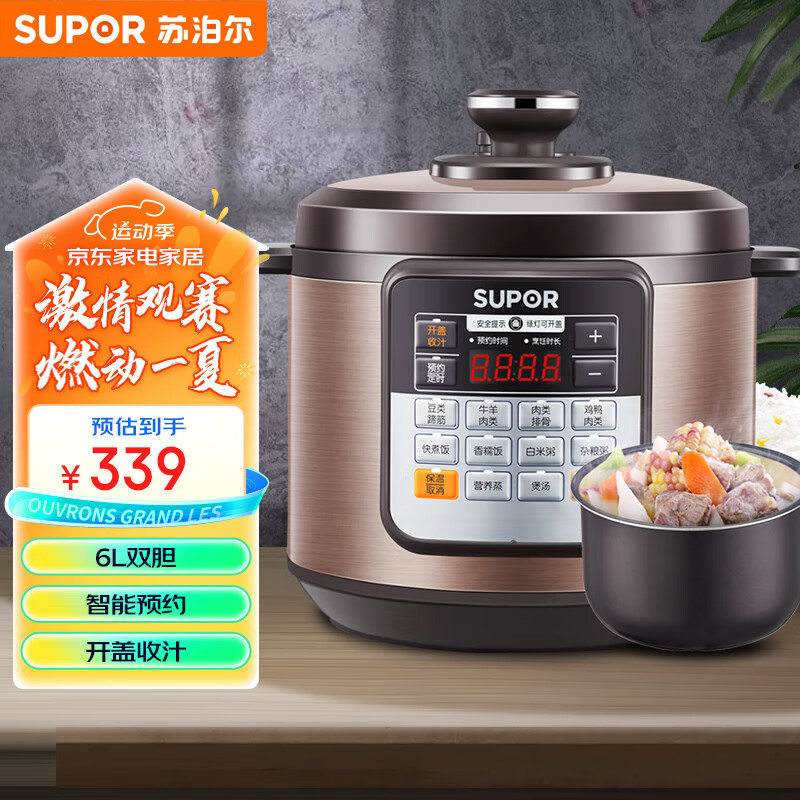 苏泊尔(SUPOR)智能电锅6L 一锅双胆 动态加压 一键排气 智能预约 CYSB60YCW10D-110 家用高压锅价格:379.00元!