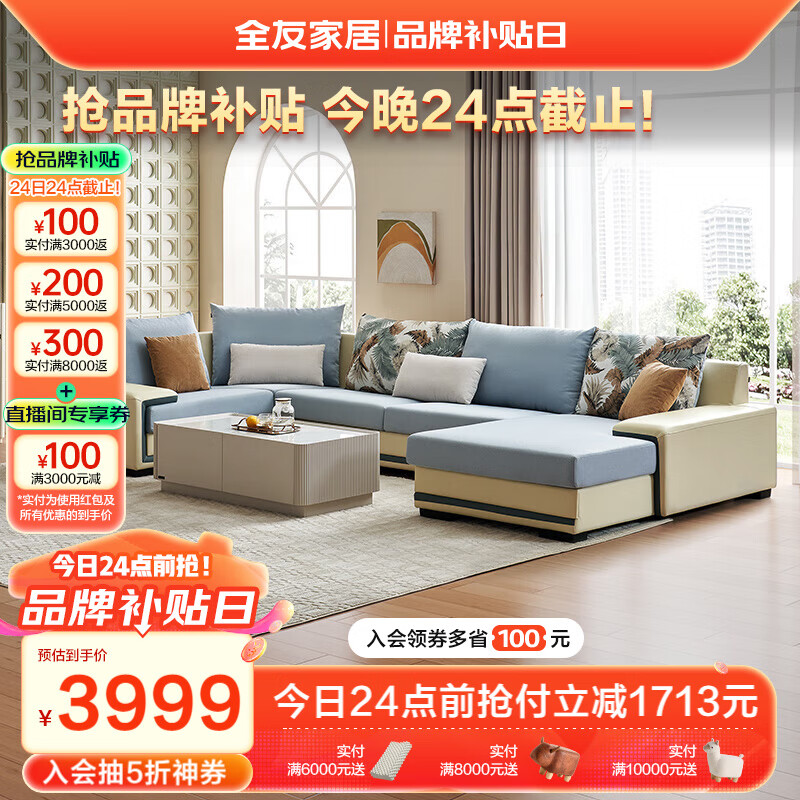 全友家居 家用布艺沙发现代简约大户型贵妃沙发家具客厅实木架102085价格:5712.86元!