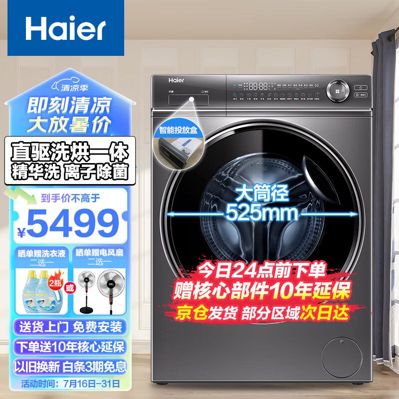 海尔(Haier)【精华洗】10KG滚筒洗衣机全自动家用大容量直驱变频一级智能投放洗烘一体G100388HBD14LSU1[家电]价格:5499.00元!