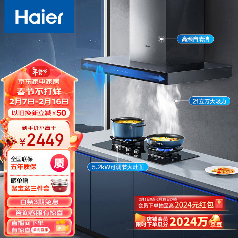 海尔(Haier)抽油烟机 欧式 顶吸排烟机 21m3/min大吸力 自动清洗 挥手智控 家用脱排油烟机T11+Q7BE3天价格:2449.00元!