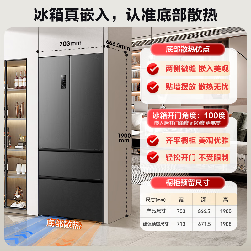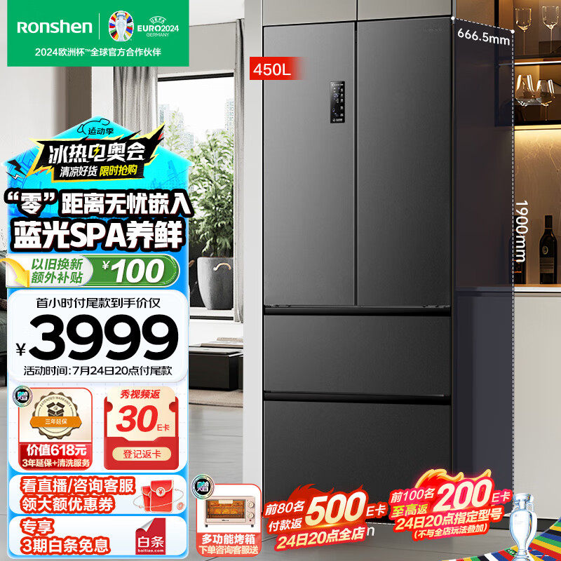 容声(Ronshen)蓝光养鲜零嵌450升法式多门对开四开门超薄嵌入式电冰箱家用一级能效BCD-450WD12MPLA底部散热价格:4499.00元!