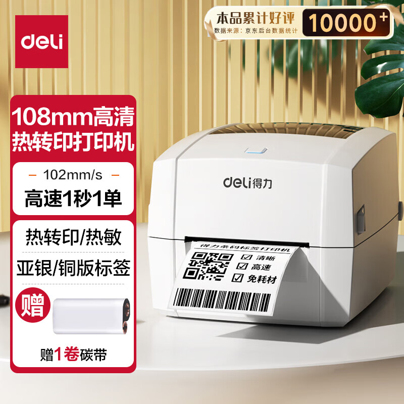 得力(deli)DL-888T热转印打印机 固定资产快递仓储零售服装吊牌 108mm商用办公碳带标签高清不干胶条码打印机价格:749.00元!